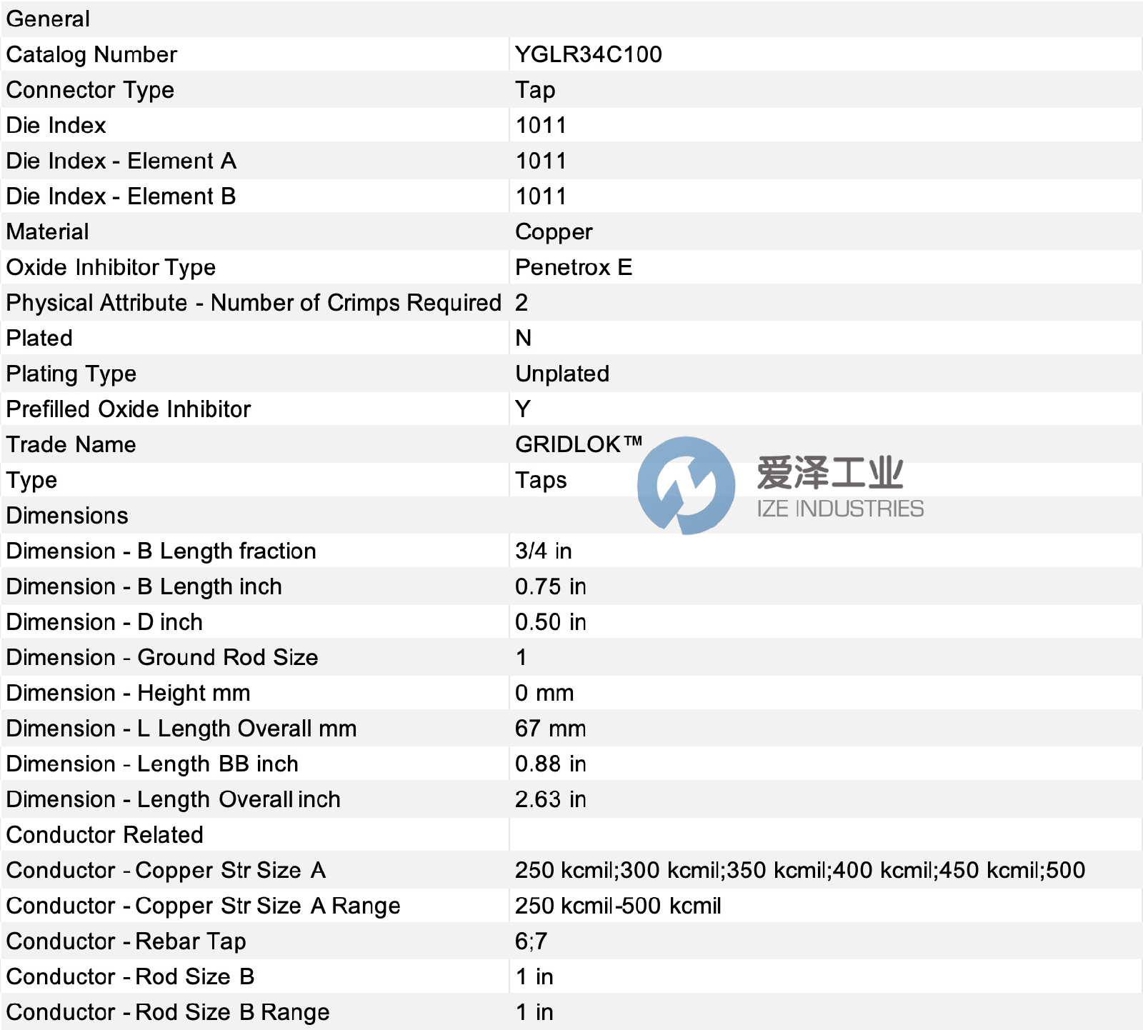 接地棒连接器,适用于 250 kcmil 至 500 kcmil 商用铜缆,248.8 kcmil 至 498.8 kcmil 铜焊接,1" 接地棒,6, 7 号钢筋。