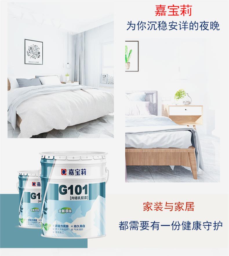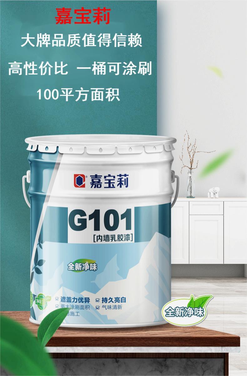嘉宝莉G101涂料 内墙漆乳胶漆 白色环保刷墙漆 采用环保乳胶材料 配制其他辅助剂等组成 经过现代新技术加工成内墙乳胶漆 具有抗碱 净味 遮盖力好等