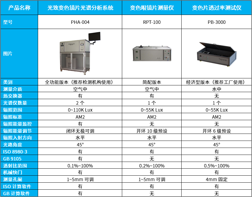 变色眼镜片测量仪符合GB 10810.3、ISO 8980.3、ISO12312-1 & ISO12311等标准中光致变色类镜片的测量要求。