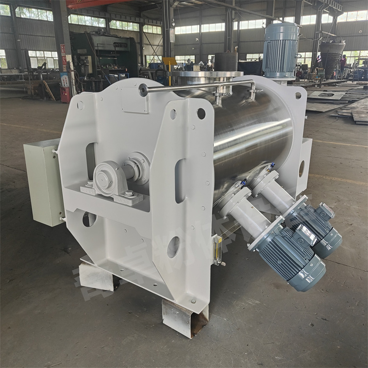 犁刀混合机由筒体、旋转主轴、犁刀组、粉粹器组、支撑件、传动件、喷头、夹套等构成。启动电机后,主轴带动犁刀组旋转,物料沿犁刀两侧面的法线方向抛出,流经粉粹器组时,被高su旋转的粉粹器迅速地打断、分散。物料被高su 粉粹器分散后,跌入混合机底部,犁刀组提供了物料混合所需要的复合力,被混合物料在混合机内部做复合循环,迅速到达混合目的。犁刀式混合机主轴及粉粹器组固定方式为外置轴承座,和筒体接触处采用轮毂填料密封,其添料盒为精加工件,从而混合机的密封性能,不漏料,很好地保护了外置轴承。混合机底部采用气动大开门结构,密封严密,卸料速度快,卸料干净,更换物料时的清洁力度小。喷雾操作有气动和电动两种方式可选:气动喷雾需要空压机配合,喷雾均匀;电动喷雾为流体泵直接打入,但喷雾均匀度不及气动方式。有的混合场合,需要在一定温度下进行混合,这需要在犁刀混合机筒体外安装加热夹套。加热方式有电加热和导热油加热两种方式可选:电加热方便,但升温速度慢;导热油加热需要配置油锅和导油动力、管道,投资较大,但升温速度快。