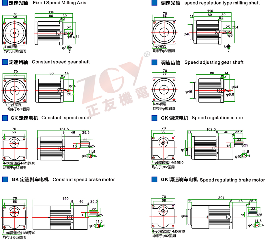 \ \电机轴8MM,电压有单相220V、三相380V/220V,有调速、定速、光轴、刹车等等,购买前请与客服联系