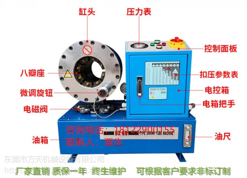 液压管扣压机价格 胶管扣压机又叫液压压管机,扣管机,啤油喉。该液压压管机是在压力作用下使金属接头产生变形,从而平稳、***地扣压在胶管上的专用设备、如(液压机械、注塑机、挖机、装载机、吊机、汽车空调管),是液压机械厂,挖机维修点的必选设备。本扣管机模块采用双斜面设计,扣压力加大,压管无锥度,使用寿命长,低噪音,具有体积小,重量轻,功能多,开模快,易操作,好维修等优点。本机自1999年开始投入市场,2年内故障率不到1%,是一款性能稳定,简单易用,经济型的大口径液压压管机.