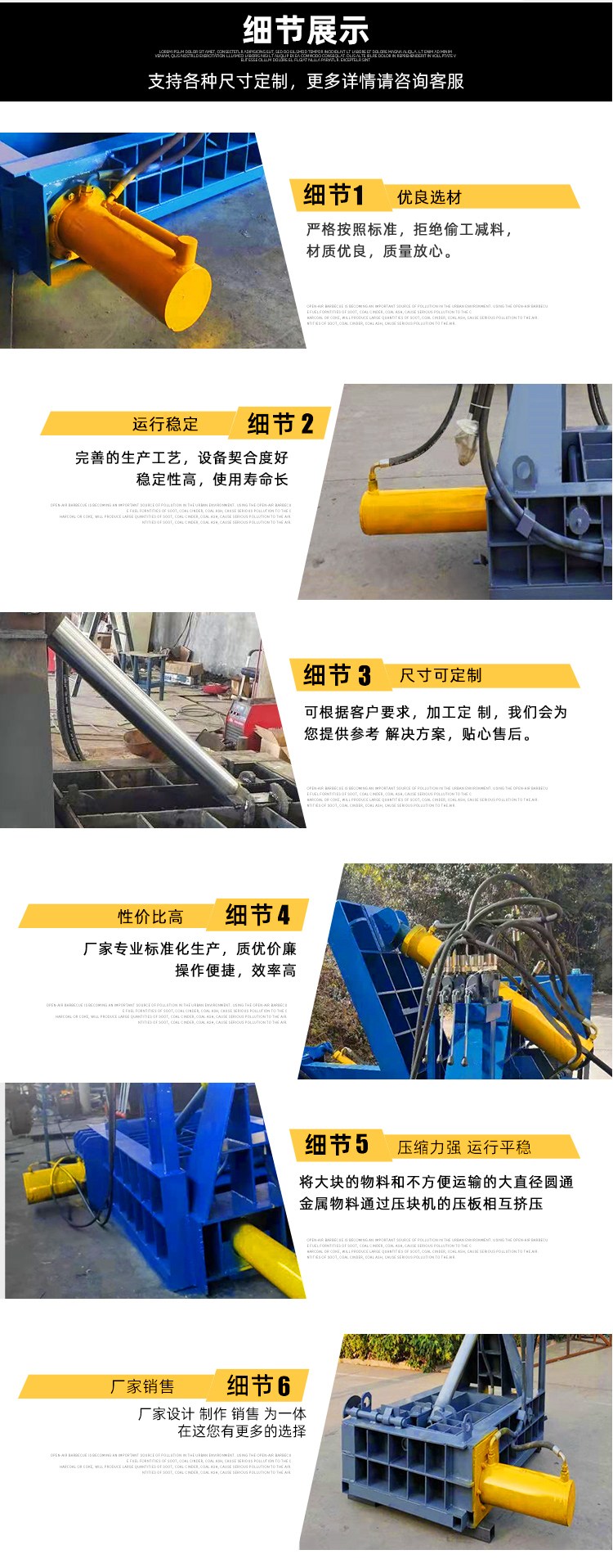 1.加大液压缸。液压金属废料压块机将打包物料置于打包机料箱内,液压油缸工作打压,将打包物料压缩成型,压制成各式金属包块。