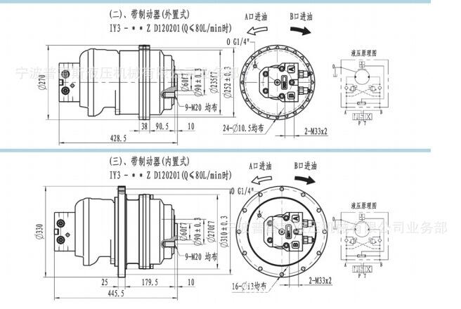 5.液压传动装置均可双向旋转,具体转向见附图。如用户要求与图示转向相反,请在订货时注明;