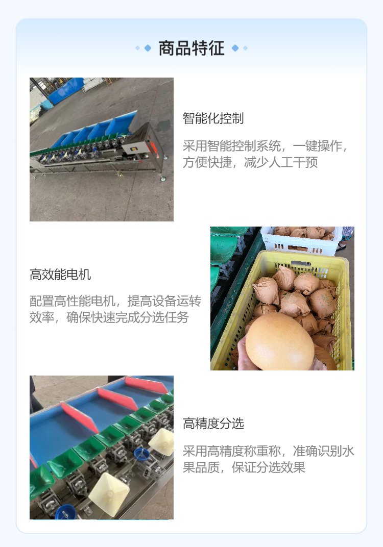 设备适合分选水果 | 苹果、梨、桃、石榴、释迦果等 | ||