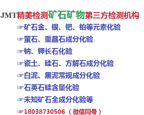 公司主要检测矿石、金矿石;铅矿石;锌矿石;萤石;硫铁矿;硫精矿;钼矿石;金红石 .稀土、花岗岩 、大理石 、板岩 、复合石板材 、人造大理石,主要检测项目有: 成分分析、矿石鉴定、岩相分析主要成份:全铁;硅;铝;镁;钙;硫;锰;钛;铬; 镍;碳C;磷; 烧灼减量; 铜;钾;钠 铝土矿 主要成份:三氧化二铝;三氧化二铁;氧化镁;氧化钙;氧化钾;氧化钠;氧化锰;硫;烧失量 石灰石 主要成份:氧化钙;氧化镁;硫 铜矿石 主要成份:铅 锌 硫 铜 镍 锰矿石 主要成份:镁 铝 硅 磷 硫 钾 钙 钛 锰 铁 镍 铜 锌 钡 铅 铬矿石 主要成份:三氧化二铬 ;全铁 硫 ; 交货批水分;镁;铝;硅;钙 ;钙 ;钛;钒;铬 ;锰;铁;镍