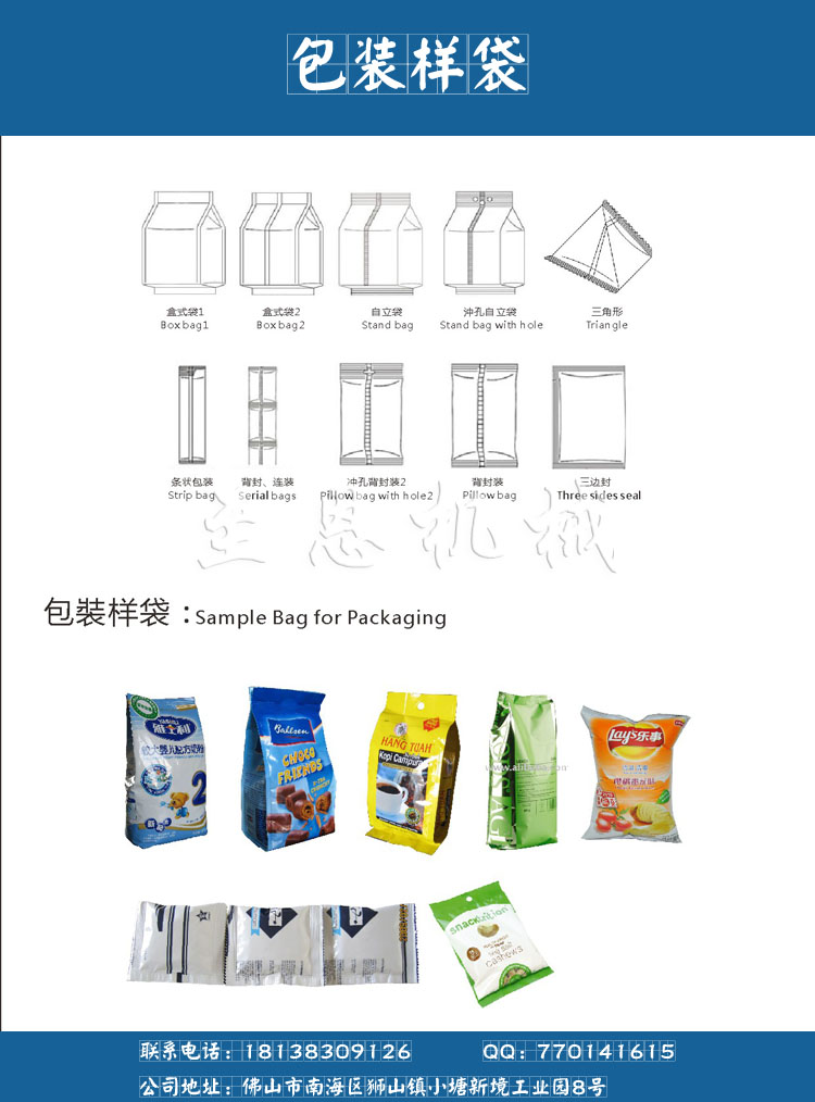 适用于食品类如:调味酱料,蛋清, 果酱, 沙拉酱, 莲蓉, 豆沙以及非食品类如: 油, 洗涤剂, 润滑油等大包装夹料封口, 特别是包装出来的袋子内没有空气, 更有效的保证产品保鲜的要求。