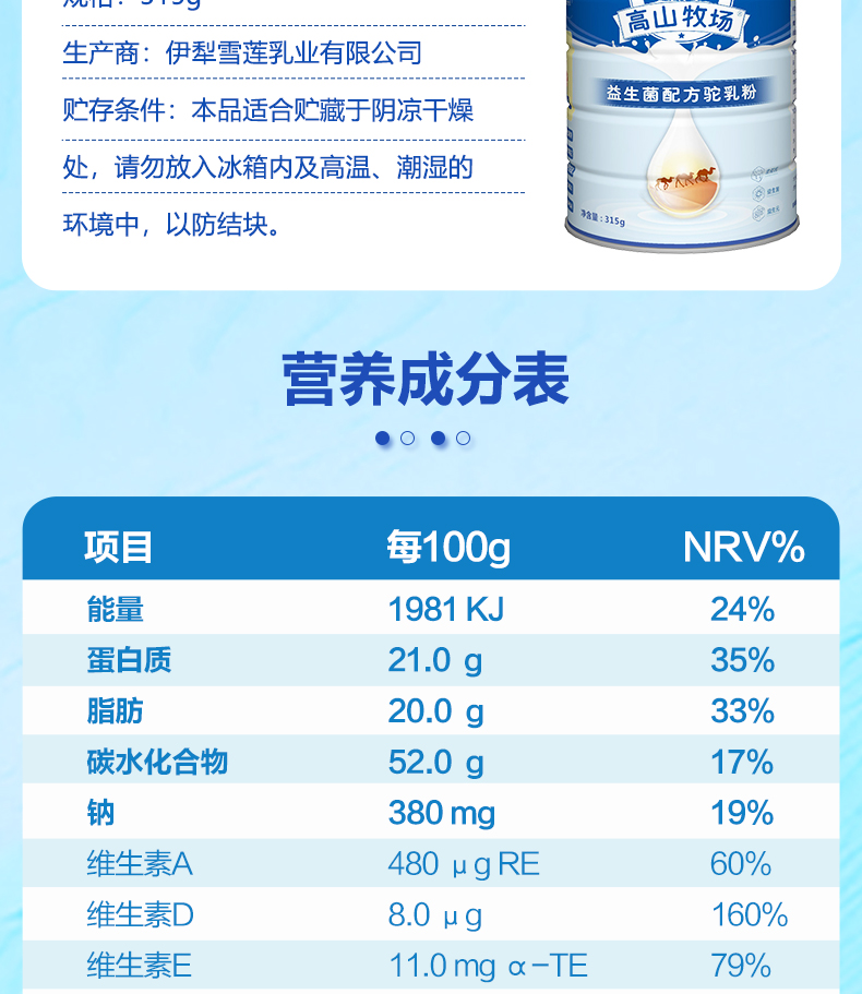 高山牧场儿童老年可用益生菌配方驼奶粉315g/罐 一件代发雪莲乳业 保质期 | 24个月 | ||