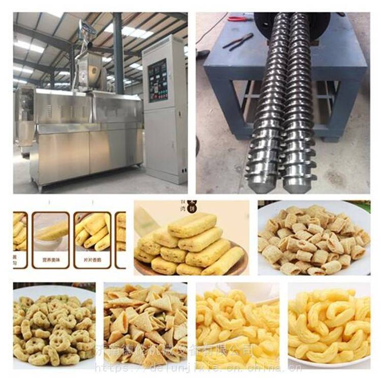 ????该线是继 代膨化食品生产线之后的另一类 小食品生产线,采用玉米淀粉、薯类淀粉为主要原料,利用 的挤压成型工艺,使产品外形实现的感官效果,产品造型自然逼真、质感细腻、口感疏松、不裂不散。该生产线设计合理,稳定性强,自动化程度高,主机采用 的变频调速技术, 的参数控制及 的工艺流程,确保加工产品质量稳定,是传统工艺与现代技术的 结合,产品有螺旋、薯片、虾条、贝壳、圆管、次螺、圆圈、波浪、泡司等几十种可供选择。