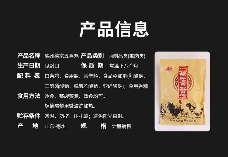 配料表 | 白条鸡、食用盐、香辛料、食品添加剂(乳酸钠、三聚磷酸钠、脱氢乙酸钠、亚硝酸钠)、食用香精 | ||