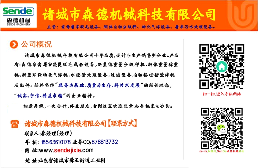 诸城市森德机械科技生产:卧式脱毛机, A字型立式脱毛机, 螺旋预冷机