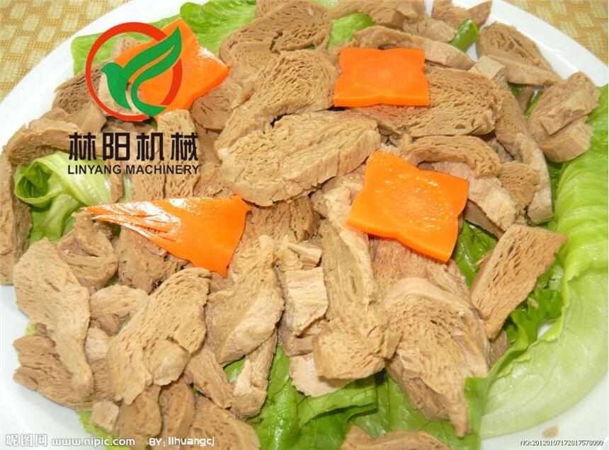 1、简介:组织蛋白生产线以低温豆粕、花生粕为主要原料,经粉磨、搅拌、调质、高温、高压、高剪切,将球形蛋白质分子打开成链状并重新组织化,形成如肉状纤维结构的如瘦肉状且有咀嚼感的新型食品;其产品营养价值高,具有肉的状态和口感,不含胆固醇和动物脂肪,具有吸油、吸水、吸味的特点;广泛用于火腿、香肠、罐头、快餐食品及速冻食品等各类行业。