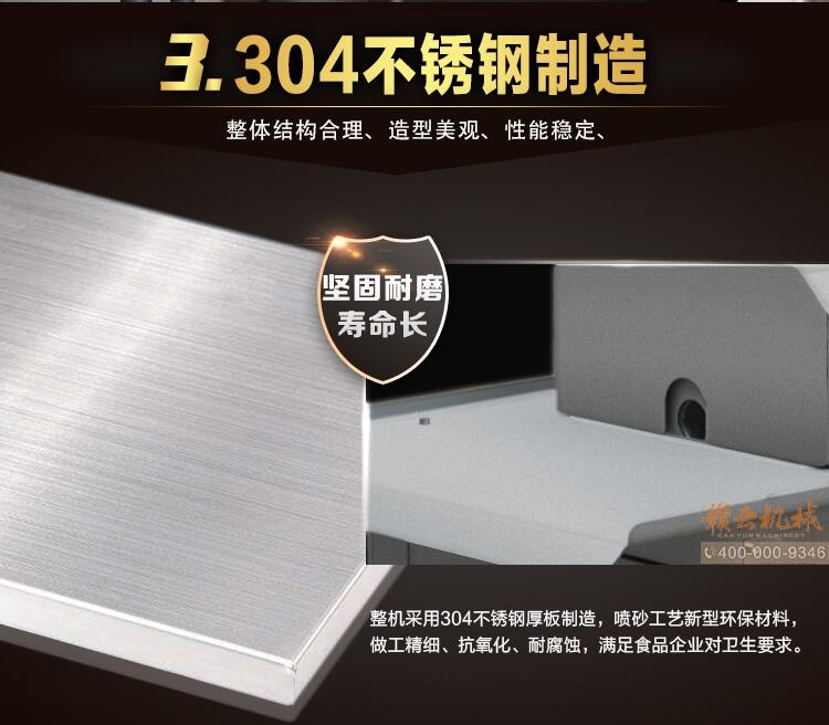 全304不锈钢制作,采用具有优良的不锈钢耐腐蚀性能,防水设计可直接用水冲洗。液晶触摸屏操作面板,可以自由设定扎线长度和速度,绕线圈数也可自由设定。左右夹紧输送带对压,通过调节输送带的传送距离来调节香肠扎线距离。通过可调节旋转把手来调夹紧输送带的宽度,从而适应不同直径的香肠。自动扎线结构,目动夹紧旋转扎线,发货时配套棉线圈设备到场接电即用。