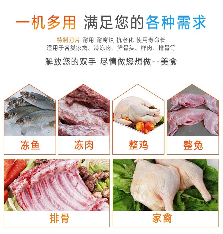 功能:该机械可切冻肉/冻骨/冻鱼等较硬肉质品,还可以完全切断新鲜的带肉骨头鲜肉、家禽、不沾刀无碎骨