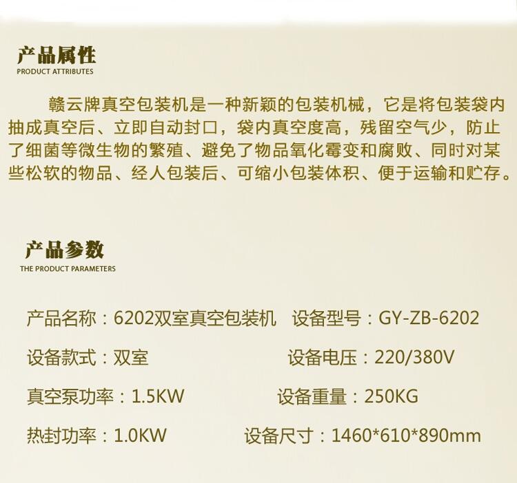 赣云牌真空包装机是一种新颖的包装机械,它是将包装袋内抽成真空后、立即自动封口,袋内真空度高,残留空气少,防止了细菌等微生物的繁殖、避免了物品氧化霉变和腐败、同时对某些松软的物品、经人包装后、可缩小包装体积、便于运输和贮存。