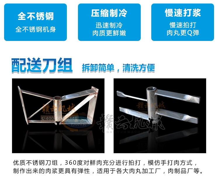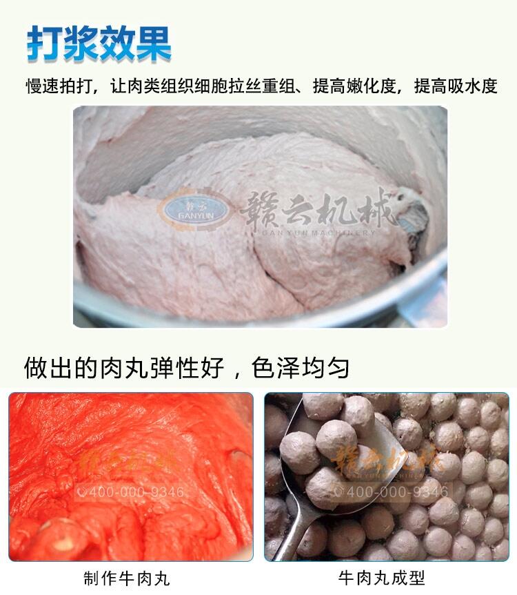 特别是正宗的潮汕牛肉丸制作,更是用这种带制冷的牛肉丸搅拌机拍打,整机采用304优质不锈钢材质,配2把搅拌刀,一锅打浆30斤左右,机器出厂标配380V电压 4KW纯铜线电机,如果要定制220V电压设备咨询客服