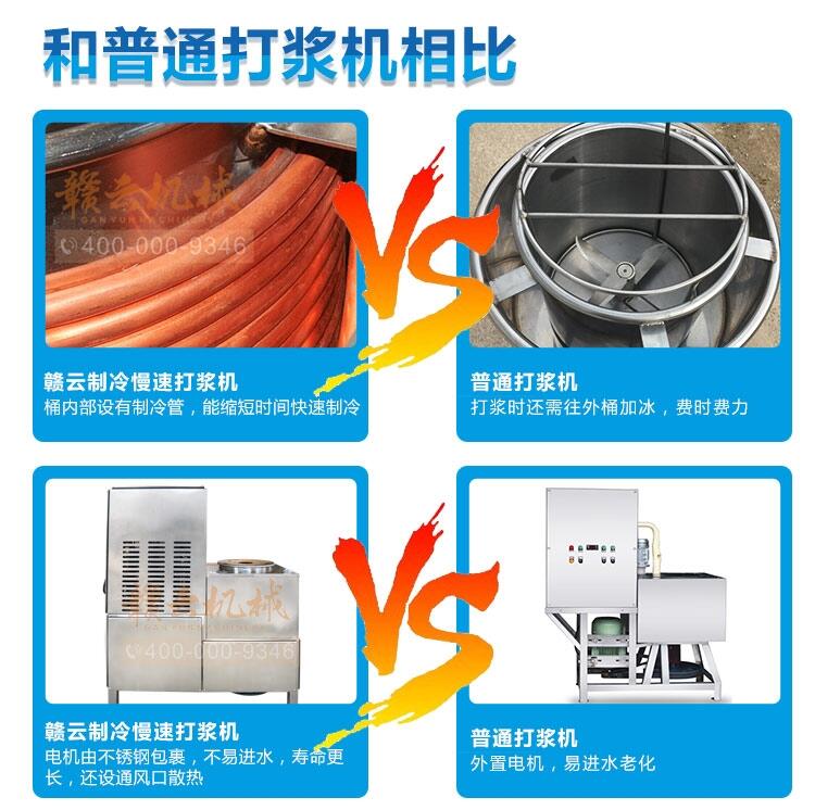 制冷式牛肉丸打浆机,采用先进的压缩制冷系统,对打浆外桶进行制冷,有效确保肉类制品在打浆过程肉类品质,防止升温改变肉质,整机采用皮带轮减速,通过慢速刀旋转拍打肉粒鱼糜等并调配成有一定粘稠度的浆状物料,便于成型机成型,其拍打过程中能对肉类组织细胞拉丝重组,加大吸收水分,提高肉类的嫩化程度,打出来的浆类制成肉丸鱼丸等,弹、脆、有嚼劲,产品一经推出,深受肉制品加工客户青睐。