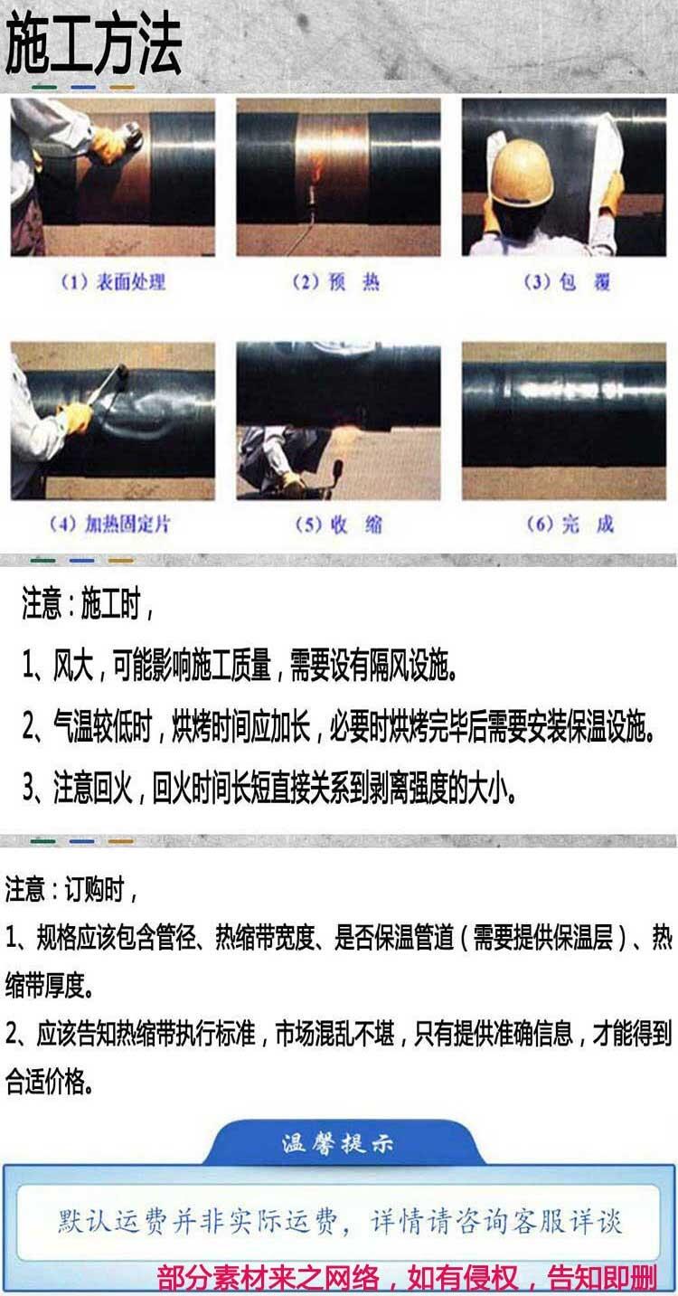 配合性能优异的热熔胶及底漆,  公司生产的热收缩带能适应不同的运行温度条件,抗蠕变性能好,寿命长能与管道同龄。