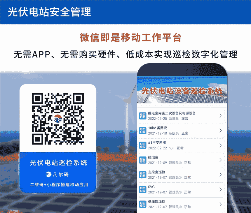 在光伏电站巡检工作中,将二维码应用于电力行业光伏电站日常巡检、特殊巡检、定期全面巡检是一种低成本的信息化管理方式。凡尔码云巡检平台“二维码+小程序+移动互联网”,一台巡检点粘贴一个二维码;微信扫一扫即可查看日常巡检情况进行详细记录,填写巡检记录,发现问题或故障及时报修,保障生产任务按计划运行。