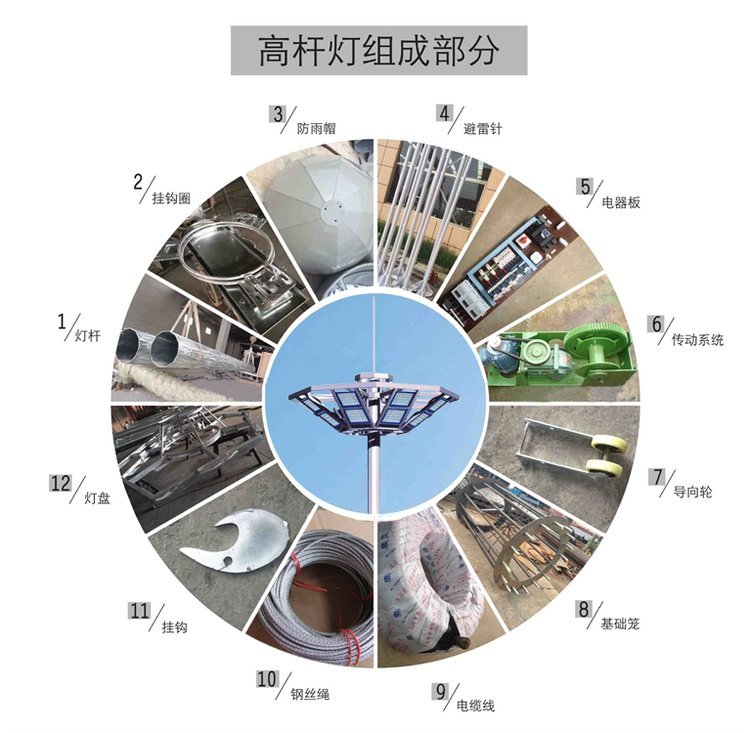 高杆灯一般是指15米以上钢制锥形灯杆和大功率组合式灯架构成的新型照明装置。它由灯头、内部灯具电气、杆体及基础部分组成。灯头造型可根据用户要求、周围环境、照明需要具体而定;内部灯具多由泛光灯和投光灯组成,光源采用NG400高压钠灯,照明半径达60米。杆体一般为棱锥形独体结构,用钢板卷制而成,高度为15-40米,多为两到三节构成。