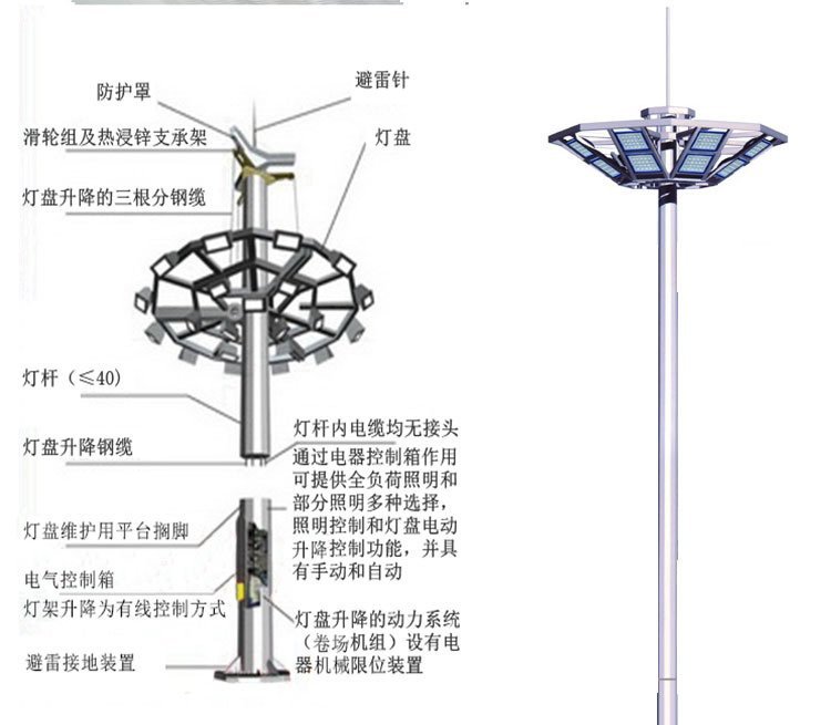3.电动升降系统由电动马达、卷扬机、三组热浸镀锌控钢丝绳及电缆等组成。灯杆体内安装,升降速度为每分钟3至5米。4.导向、卸荷系统由导向轮和导向臂组成,确保灯盘在升降过程中不会发生横向移动,保证灯盘上升到位时,能将灯盘自动脱落并由挂钩锁定。5.照明电器系统设6-24盏400w一1000w金卤(白光)、投光、泛光灯具,电脑时控器可自动控制开关灯时间及部分照明或全照明,?