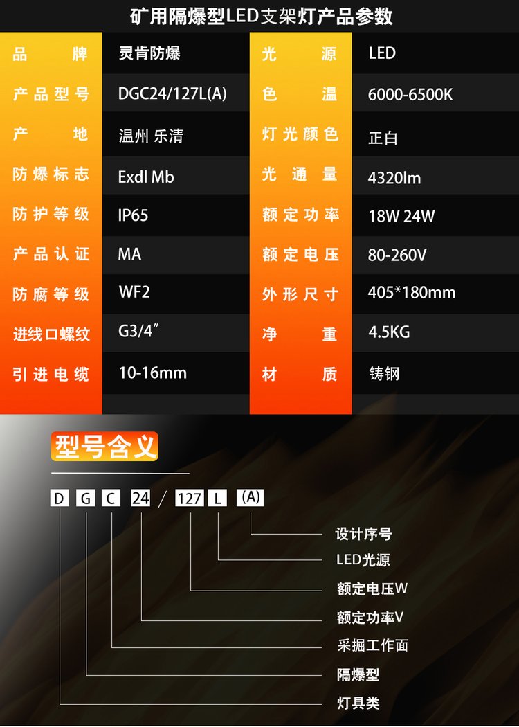 长方形款井下隔爆工矿灯DGC24/127L(A)煤矿用防爆型LED照明支架灯 品牌 | 灵肯防爆 | ||
