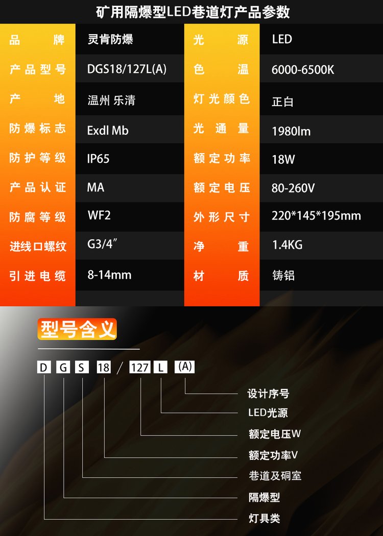 节能高效矿用防爆型LED巷道照明灯DGS18/127L(A)煤山井下隔爆电棒 品牌 | 灵肯防爆 | ||