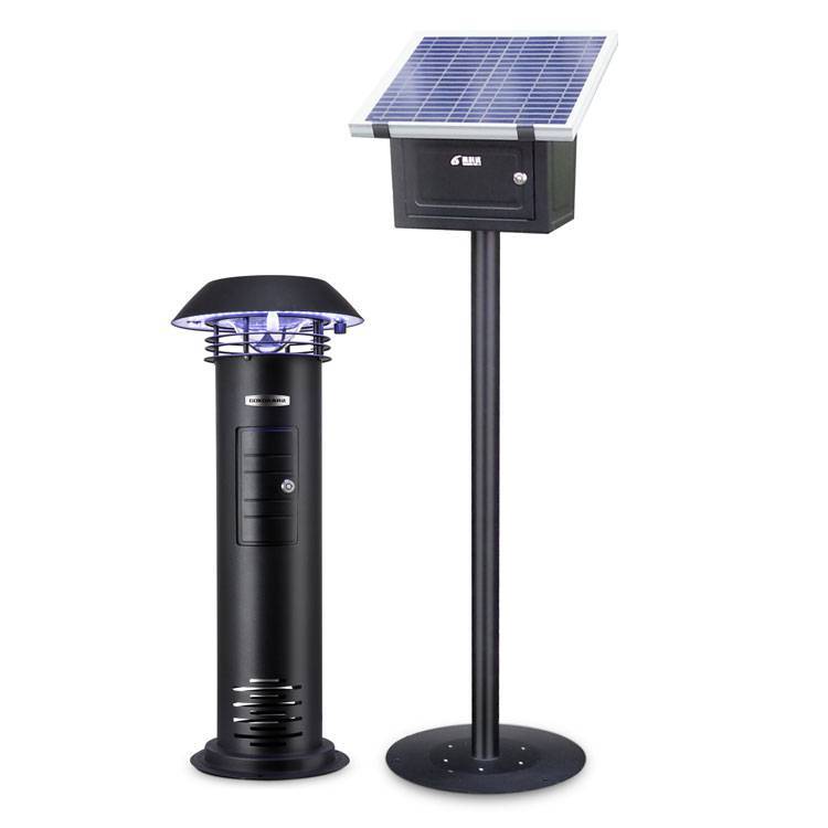 GOKDA高科达太阳能灭蚊灯H-X5-TYN使用全金属机身,工业设计造型美观,具户外照明、灭蚊、杀菌、环境装饰一体化功能。运用先进的生物诱蚊技术和物理灭蚊设备,采用订制进口LED UV诱蚊芯片所散发的365紫外诱蚊光波 蚊虫信息素气味 体温模拟引诱蚊虫靠近,高速旋转的涡流风机将蚊虫吸入储蚊盒并风干至死,安全无污染。从而达到绿色除虫、环保灭蚊的目的。