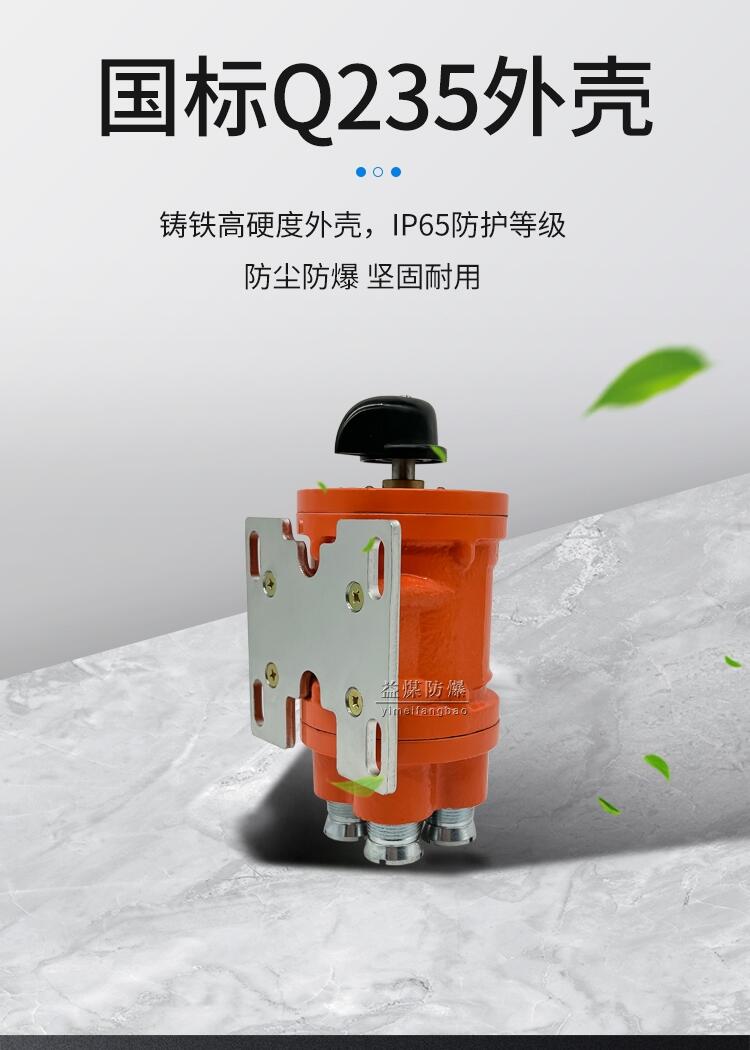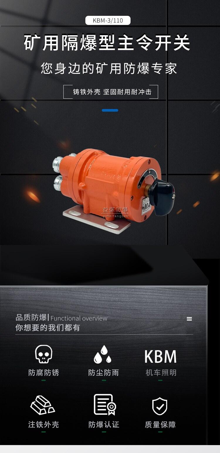 KBM-3/110矿用隔爆型主令开关(以下简称主令开关)是作为防爆特殊型蓄电池式电机车、无轨胶轮车上的前后照明灯和信号灯线路中作转换通断电之用,以实现电机车往返动运行时前有照明灯后有红灯。