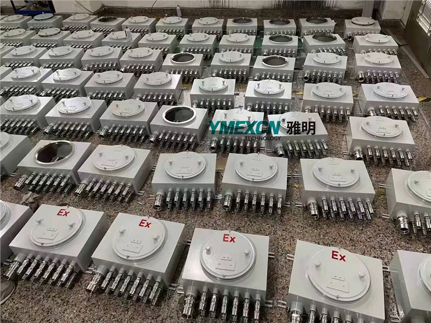 因此这些产品也划归到这类产品中来,防爆配电箱一般均为复合型结构,由外壳采用增安型结构,内装元件采用隔爆型元件或增安型的元件,或一个隔爆型主腔内装各种元件,或两种结构结合成一体:外壳采用ZL102铝合金压铸成型,表面高压静电喷塑,不锈钢外露紧固件。