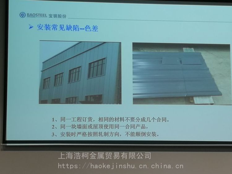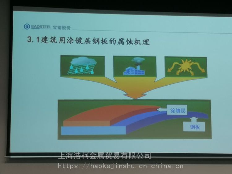 1993年建设。采用宝钢绯红聚酯彩涂,热镀锌基板,镀锌量为180克/平方米,钢种为TSt01。使用了十八年后,涂层颜色依然鲜艳,涂层厚度更是与出厂厚度接近,达到19.8微米,涂膜保存完好。