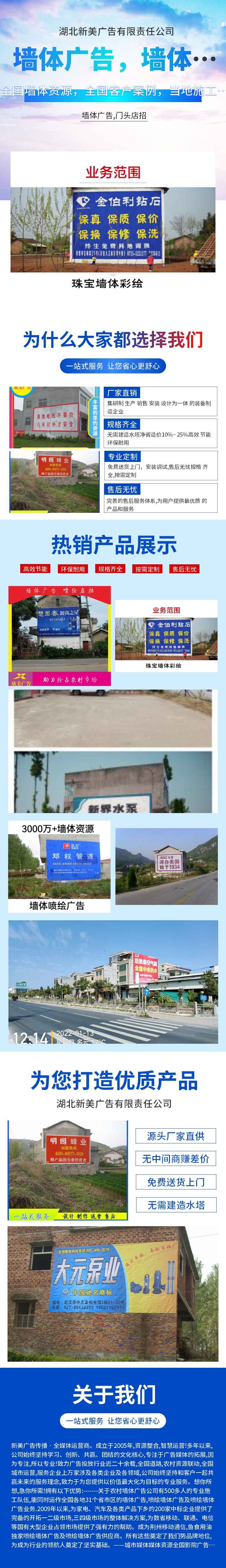 山西杏花岭价格手绘刷墙体广告发布山西太原发布入木三分其次,企业可以根据不同的墙体广告投放位置,涂科刷字广告设计不同的广告内容和形式。 比如,在商场内部的墙体广告可以采用图片和文字相结合的形式,告,如工商局、路牌广告、报纸广告、广播广告等,由于种种原因都不适合农村市场的特点突出产品的特点和优势;而在户外的墙体广告则可以采用大幅的图片和简洁的文字,以吸引行人的目光。涂科刷字广告此外,企业还可以结合不同的季节和节日,设计不同的墙体广告投放方案。 比如,在春节、圣诞节等重要节日前,可以设计出与节日相关的广告内容和形式,以吸引消费者的注意力。新美广告传媒公司:喷绘墙体广告的宣传优势总之,墙体广告是一种非常有效的宣传方式,企业可以根据自身的市场状况和产品定位,规划出多种方式的墙体广告投放规划,以提高品牌知名度和产品销售量农村墙体喷绘广告资源费用分析,涂科刷字广告新美墙体广告快速高的为客户进行服务,我们热爱自己多年来铸就的优的品牌,公司一直以致力于为社会提供更完善、与效果,努力让每- -次合作都成为行业典范更美的文化建设和广告装饰服务,并愿与业界携手,维护市场环境,树立行业新风,推动行业发展与广告装饰新潮流。