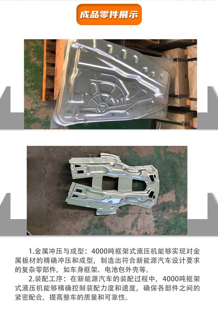 在现代工业领域中,框架液压机扮演着重要的角色,它是一种利用液压原理传递力量的机械设备,广泛应用于各种工业制造过程中。本文介绍的4000吨框架式液压机主要用于新能源汽车配件的生产制造工艺。
