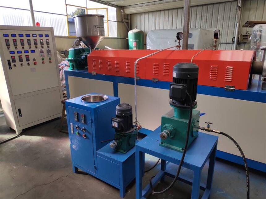 塑料发泡网挤出机组,将树脂等多种化工原料通过料斗加入料筒内,经过加热后将发泡气体注入料筒内,经料筒搅拌从模头挤出冷却成形,输入牵引机,经切刀自动切断制出不同规格的发泡网套,也可以通过更换机头、模具生产出不同规格的发泡网