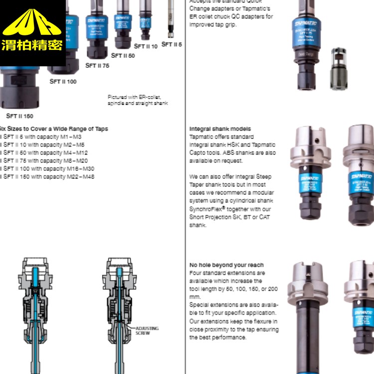 Tapmatic 的打标头是一种冲压工具,用于使用标准类型或定制的印章在工件上打标。所有这些工具都消除了二次标记操作的需要。Tapmatic 的新型DeBurr-Z浮动刀柄用于CNC 去毛刺,可在压缩和拉伸状态下浮动,使切削刀具能够遵循工件的顶部边缘或底部边缘,即使这些边缘没有明确定义,例如铸件和十字形件洞。