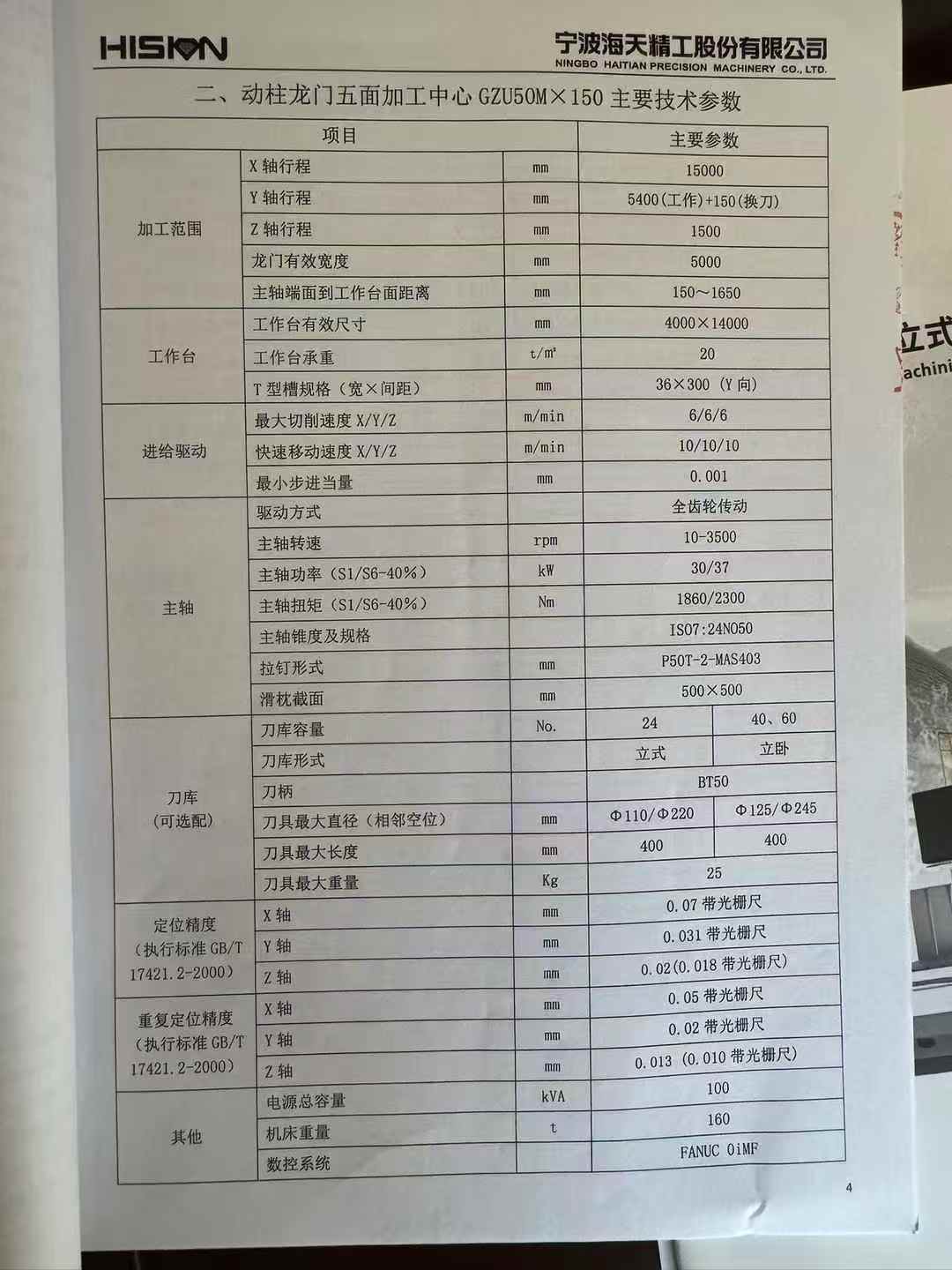 海天动柱龙门五面加工中心型号GZU50M×150,X轴行程15000mmY轴行程5400mm,Z轴行程1500mm机床重量:160吨