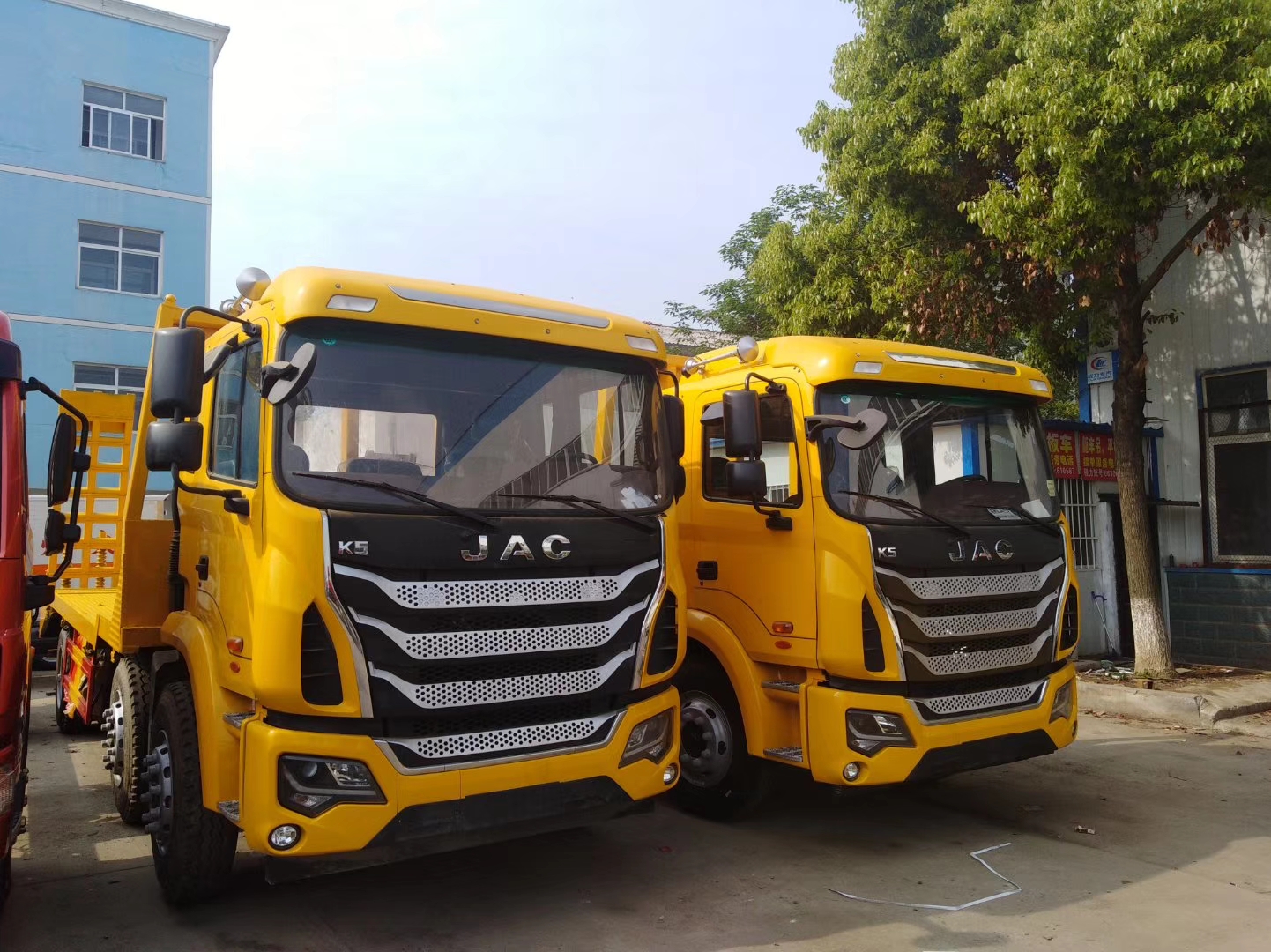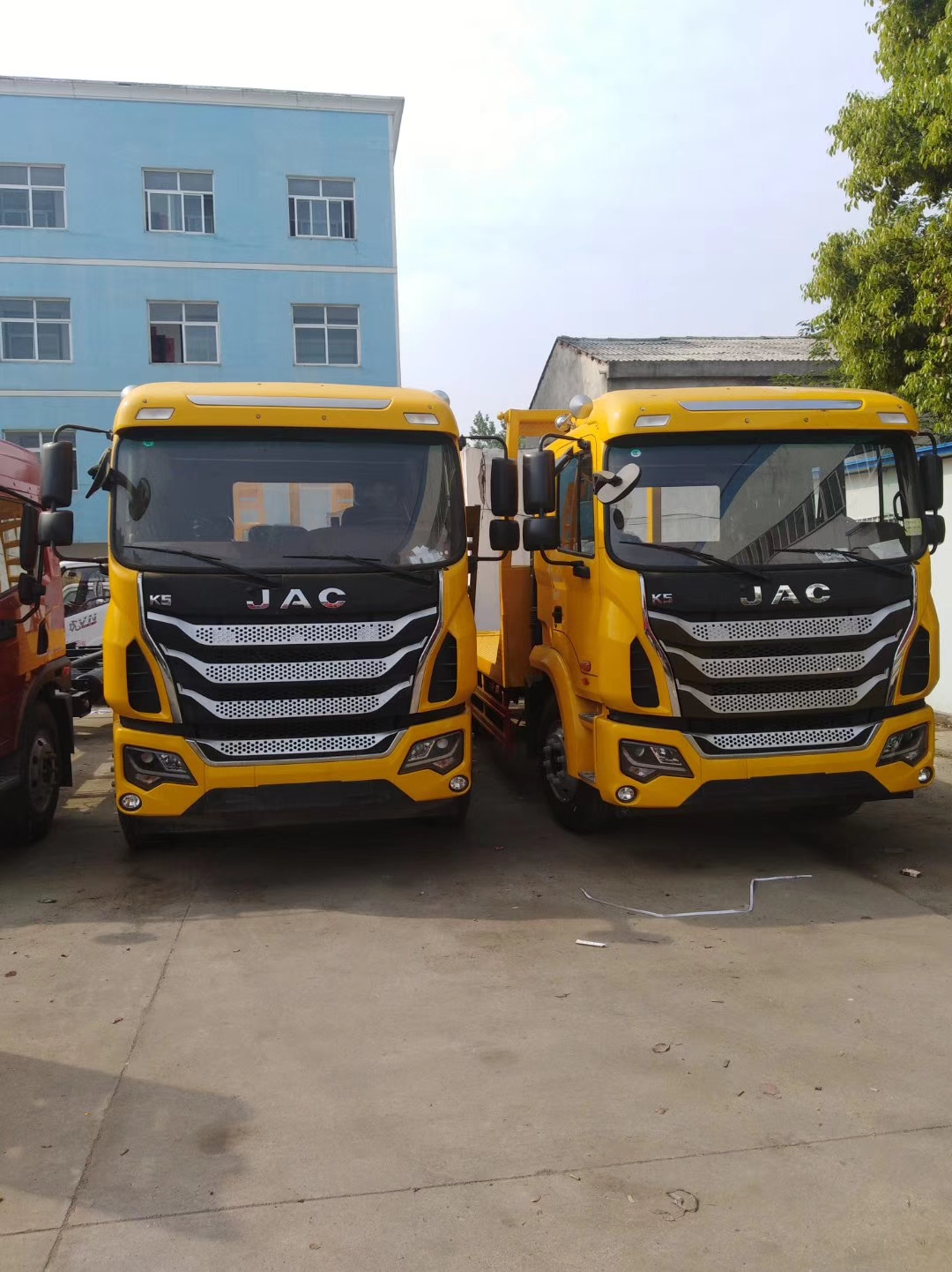 江淮K5小三轴平板运输车,玉柴6缸220马力发动机,陕齿8档变速箱带高低档,1700+3800mm轴距,10.00R20钢丝胎,153【10吨】后桥,带原厂ABS,方向助力,空调,电动门窗,日间行车灯,气囊座椅,整车尺寸:9800*2550*3140mm,平板含斜坡长7.2米,宽2.55米【可手动伸展到3.2米】,可载重25吨以下挖掘机.
