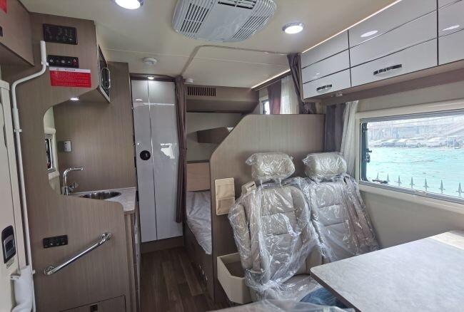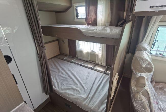 休息区设有子母床,提高空间利用率,补充的床位住的也更舒适。内侧设有房车专用外推出,内侧设有纱帘和布帘。同时该车还设有顶置空调、独立燃油加热器、乘客区独立散热器等。车内有独立卫生间,配置丰富功能完善。电动马桶、淋浴话说、带触控灯的化妆镜、洗脸盆、浴帘等基础配置。
