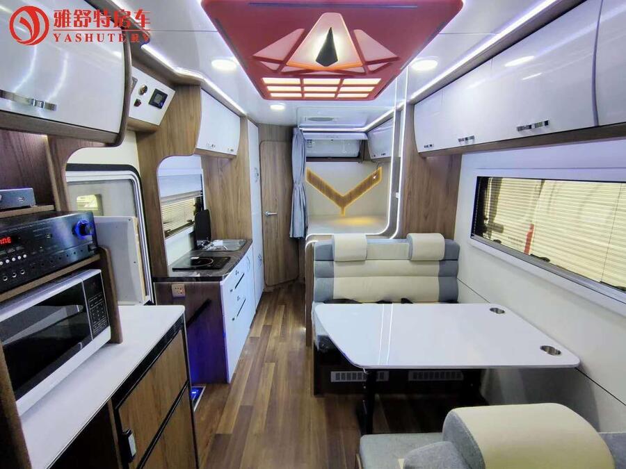 厨房区位于车厢中部。配备电磁炉、带盖式洗手池及一级家用变频空调等;集成控制面板位于洗手池周围,可控制车内照明及各个电器开关等。周围还有一组220V电源插座及USB充电接口,便于手机等小型电器充电。对面则是一组储物柜及50L多美达车载冰箱(可选配)。