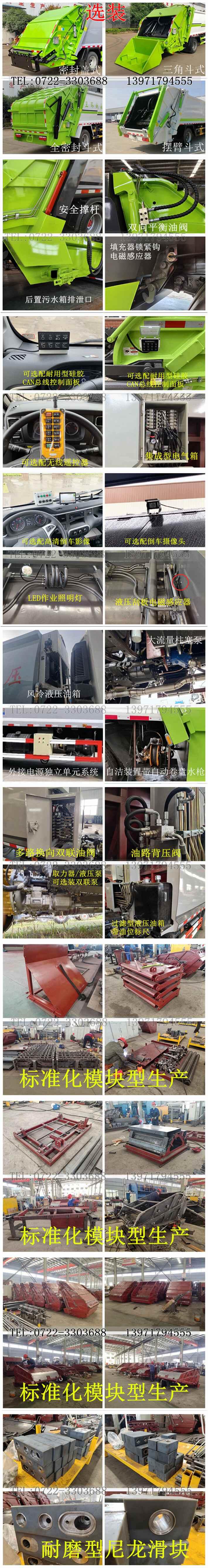 上装标配:优质高强度Q345锰钢制作箱体,内壁经过防锈防腐处理。双泵双阀、双向压缩结构,带尾部侧部带双污水箱,烟台未来油缸,扬州中梅多路阀,齿轮泵,西门子PLC手电一体操作模式,带驾驶室操作,标配垃圾翻转斗或挂桶翻转板。
