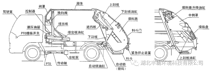 12)配装驾驶室内操作系统,通过驾驶室操作可完成填装器升降和推板卸料垃圾过程。
