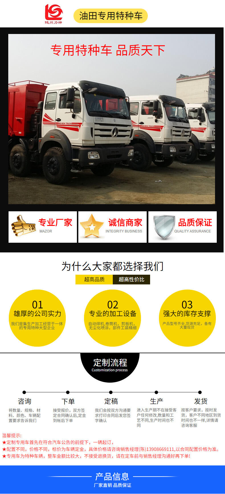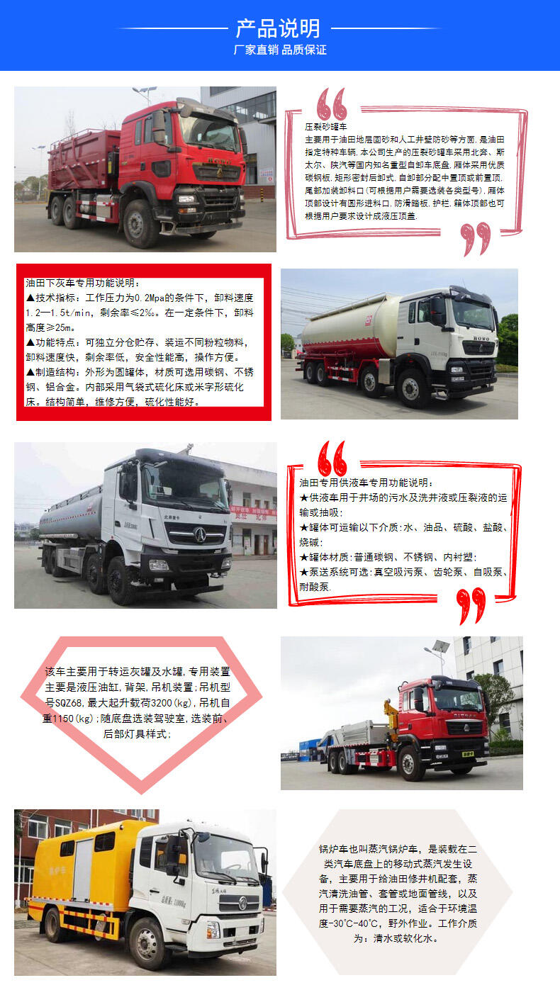 压裂砂罐车主要用于油田地层固砂和人工井壁防砂等方面,是油田特种车辆,本公司生产的压裂砂罐车采用北奔、斯太尔、陕汽等国内知名重型自卸车底盘,厢体采用碳钢板,矩形密封后卸式,自卸部分配中置顶或前置顶,尾部加装卸料口(可根据用户需要选装各类型号),厢体顶部设计有圆形进料口,防滑踏板,护栏,箱体顶部也可根据用户要求设计成液压顶盖.