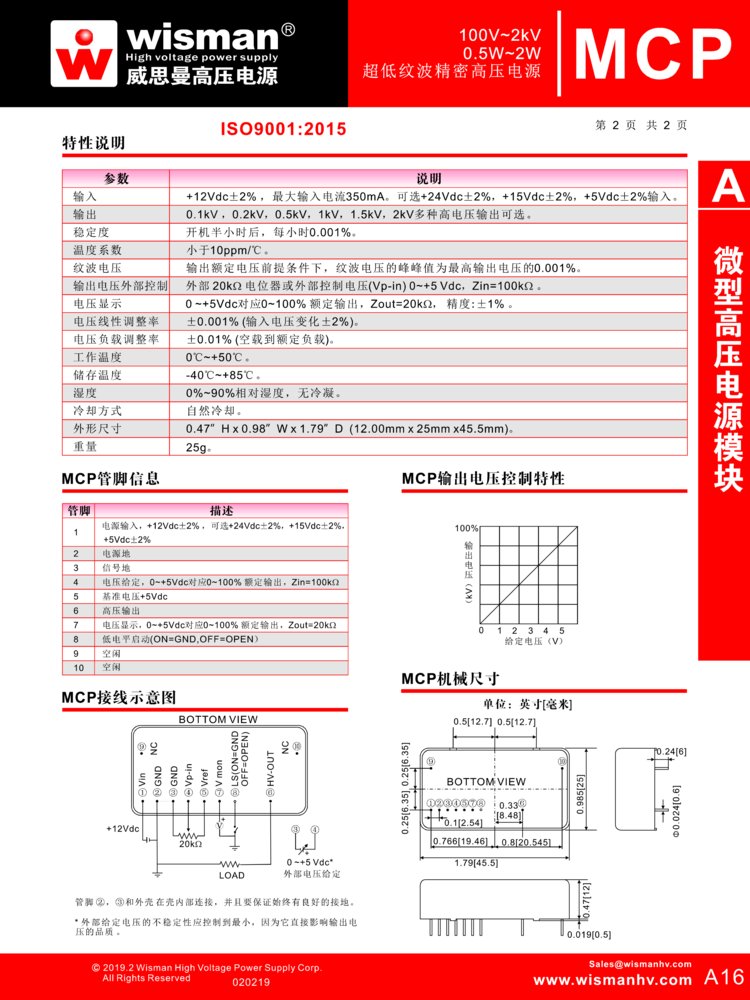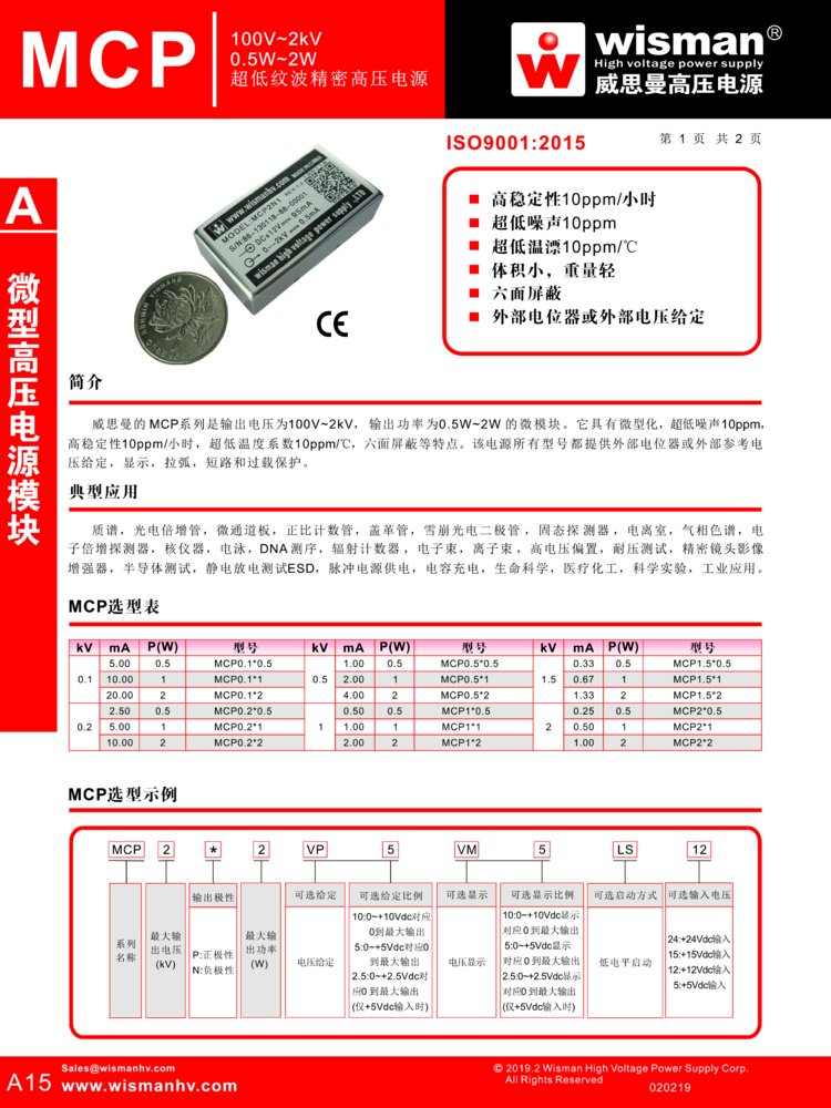 MCP系列是一款印制电路板安装式高压电源,体积小,超低纹波5mV,高稳定性,15ppm低温度漂移,六面屏蔽超低噪声。有过流、短路、拉弧等保护。