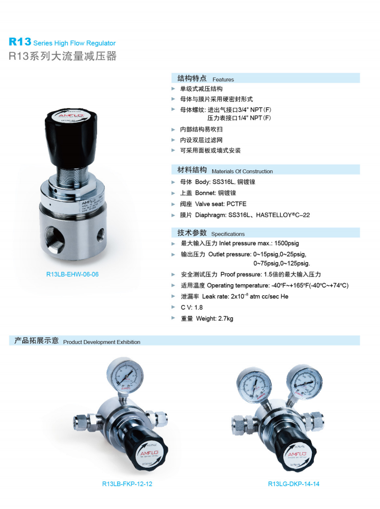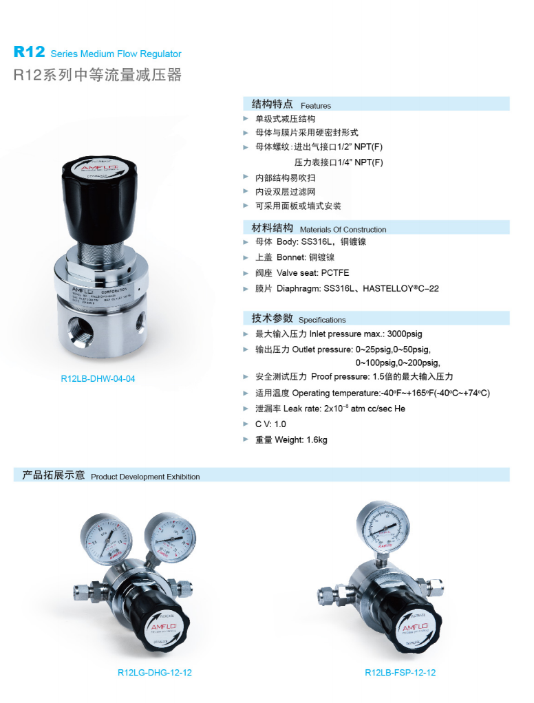 敦阳AMFLO不锈钢高纯气体减压阀实验室特气钢瓶连接R11R12R13通用