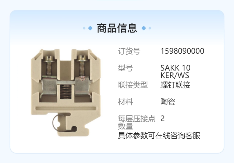 Weidmuller魏德米勒 压线框直通型接线端子 1598090000 SAKK 10 KER/WS 型号 | SAKK 10 KER/WS | ||