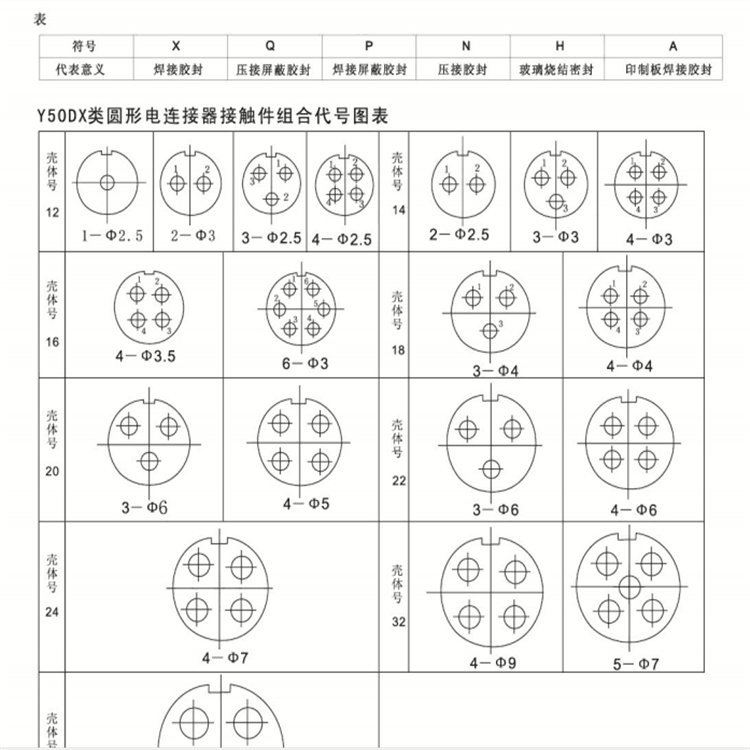 Y50DX绝缘安装板孔位排列 从插合面看插针绝缘安装板孔位绝缘安装板的孔位排列
