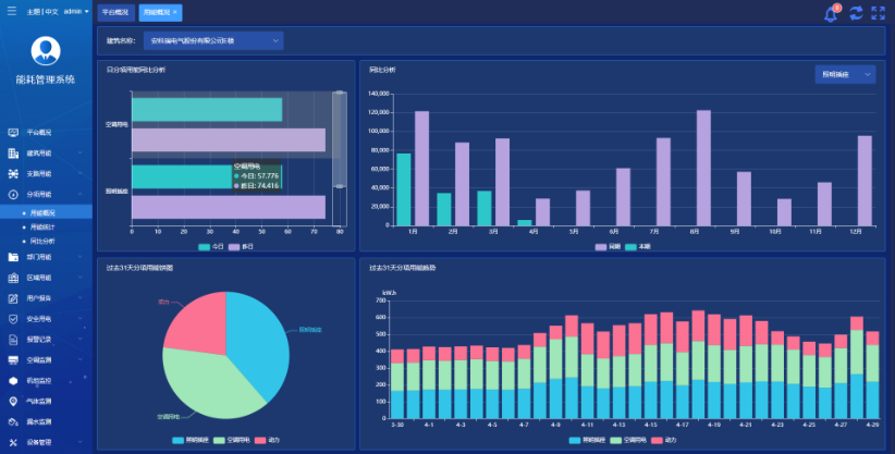 提供能耗分析报告功能,从多个维度统计分析用户能耗使用情况。报告可以提供同环比分析、复费率电量和电费分析、能耗排名分析、报警情况统计等功能。