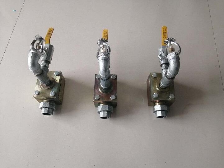超温自动洒水装置,无需电源,当测试点温度高于本装置的设定温度时,易熔化,打开阀门,实现自动洒水功能。
