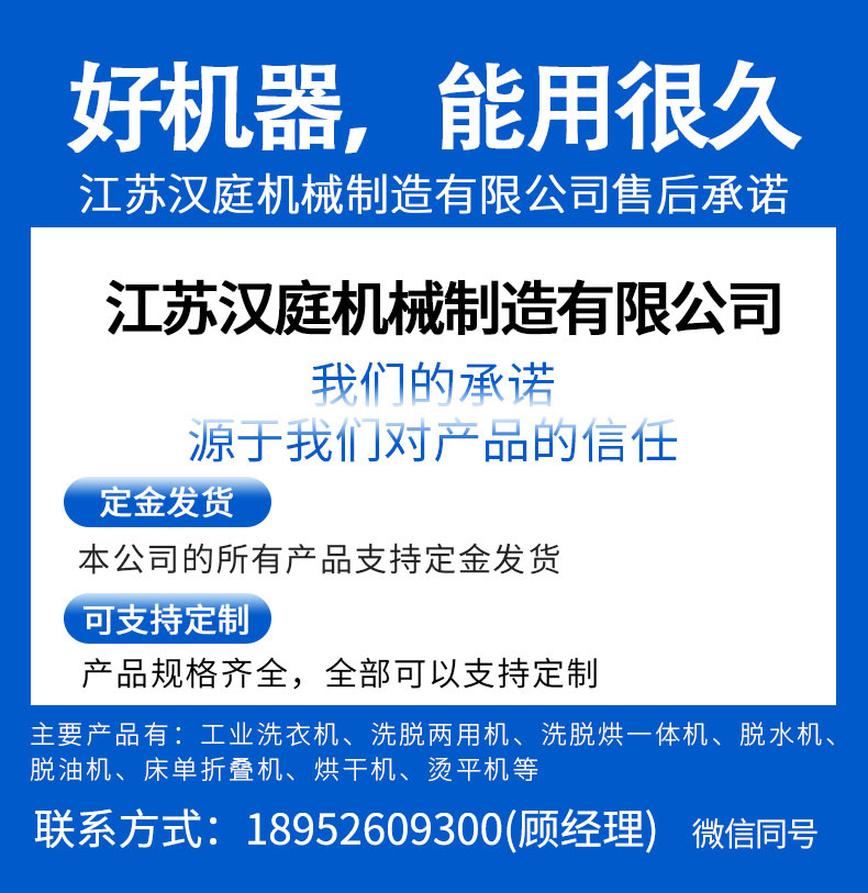 同时可为客户提供:1.节能高效洗衣房工程设计 2.合理的设备配置方案 3.公司有技术,的工程师,无偿为宾馆、学校、医院、工厂及洗衣场设计、配置洗衣房。江苏汉庭机械给您提供的不仅仅是洗涤设备!以上产品适用于纺织、印染、丝绸、皮革、针织服装后整理,水洗、砂洗、石磨、喷砂、染色等服装加工业务,以及宾馆、酒店、招待所、医院等洗衣房、食品、洗涤加工业务。