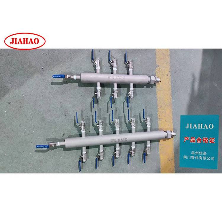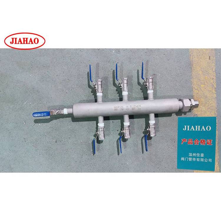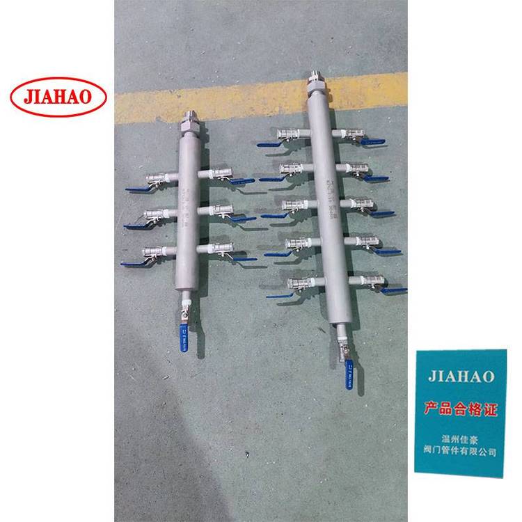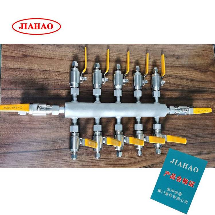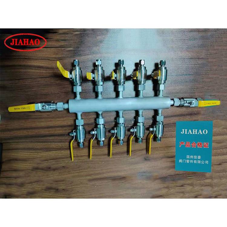 佳豪KFQ-I-6? ?KFQ-I-8? KFQ-I-10 304不锈钢气源气路分流分配器,气源分配器有4路 6路 8路 10路 12路 14路等,主管一般是DN50,材质304 316?供选择,进口一般活接头和球阀连接,或者法兰连接,排污口一般为球阀,分配点一般有针型阀?针型阀有J91W卡套针型阀 J23W外螺纹活接头针型阀,J13W针型阀等? ?球阀选择有一片式内螺纹球阀,二片式内螺纹球阀,三片式内螺纹球阀,锻钢气源球阀? QG.QY1-64P?气源球阀 Q21F-64P外螺纹球阀等。管路口径一般为8mm 10mm等,气源分配器的作用主要作为气路分流作用。进口法兰连接型号为KFQ-II-6 KFQ-II-8 KFQ-II-10 KFQ-II-12等。